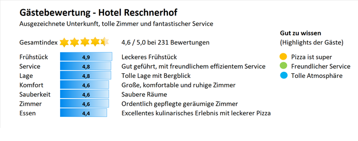 Ihre Meinung zählt! Hier sehen Sie die aggregierten Bewertungen von Reisenden aus aller Welt, die bei uns zu Gast waren. Mit einer herausragenden Gesamtbewertung von 4.6 von 5 Punkten freuen wir uns über die positive Rückmeldung. Besonders hohe Punktzahlen erreichen wir in den Bereichen Service (4.8/5) und Lage (4.8/5). Lassen Sie sich außerdem unser kulinarisches Angebot nicht entgehen: Exzellente Speisen und, wie unsere Gäste bestätigen, eine super Pizza. Buchen Sie Ihren Aufenthalt in unserer ausgezeichneten Unterkunft und überzeugen Sie sich selbst!