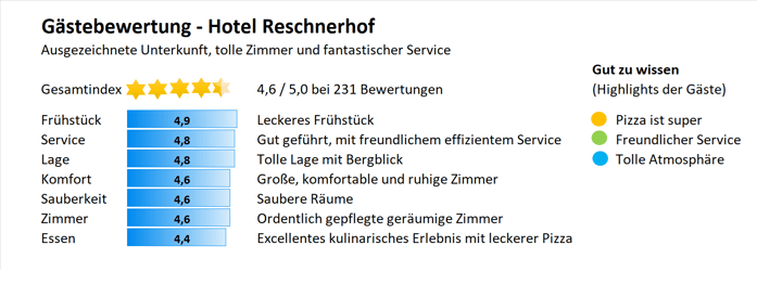 Deine Meinung zählt! Hier siehst du die aggregierten Bewertungen von Reisenden aus aller Welt, die bei uns zu Gast waren. Mit einer herausragenden Gesamtbewertung von 4.6 von 5 Punkten freuen wir uns über die positive Rückmeldung. Besonders hohe Punktzahlen erreichen wir in den Bereichen Service (4.8/5) und Lage (4.8/5). Lass dir außerdem unser kulinarisches Angebot nicht entgehen: Exzellente Speisen und, wie unsere Gäste bestätigen, eine super Pizza. Buche deinen Aufenthalt im Reschnerhof und überzeuge dich selbst!