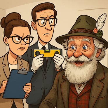Clarissa von Kontrolla – energetisch wie ein Gesundheitsamt auf Speed, bewaffnet mit QR-Scanner, UV-Lampe und einem Riechsensor aus dem Labor für Luftqualitätsanalyse. An ihrer Seite: Maximilian Perfektion, personifizierte DIN-Norm, mit einem Ausdruck seiner persönlichen 240-seitigen Urlaubskriterienliste in der Brusttasche und einem Thermometer im Jackett.