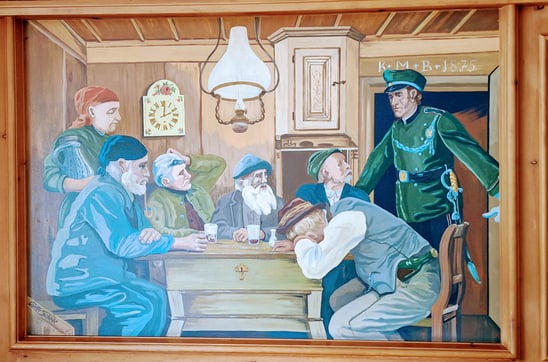 Das Wandbild hängt noch immer im Reschnerhof. Manche sehen darin nur eine alte Szene zur Sperrstunde. Andere schwören, man hört Luggi kichern, wenn die Lampe flackert.